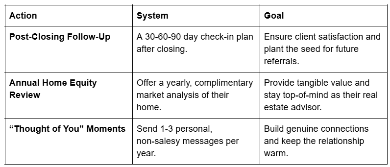 Top agents understand that there are two types of referrals: passive (which are unpredictable) and orchestrated (which are systemic). Your goal is to build a system for orchestrated referrals. This starts the day after closing.
